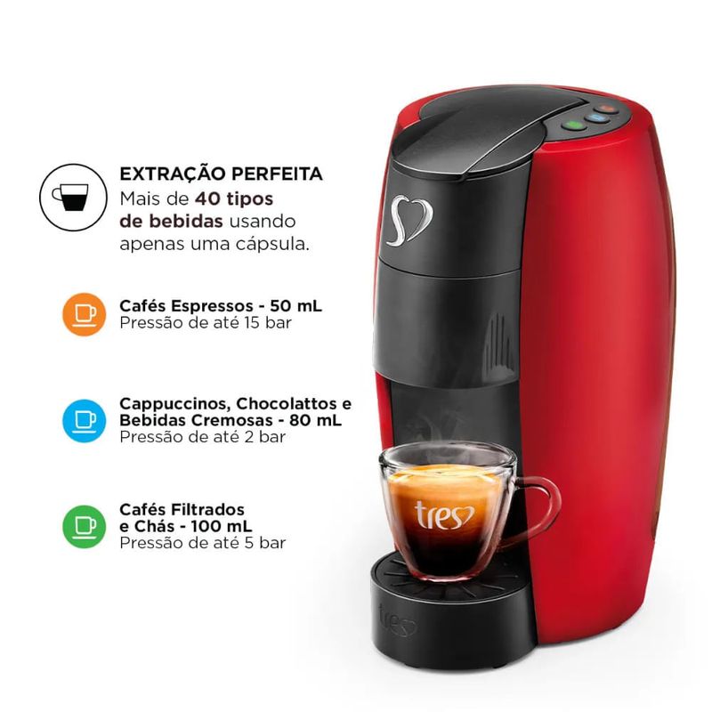 A Cafeteira de Espresso e Multibebidas Automática LOV TRES 3 Corações possui extração silenciosa que garante cafés espressos perfeitos, bebidas cremosas, cafés filtrados e chás ao simples toque de um botão. A LOV tem um compartimento externo para facilitar o descarte das cápsulas usadas e suporte para xícaras e copos long drink, que garante a praticidade na hora de preparar as suas bebidas preferidas na quantidade ideal.