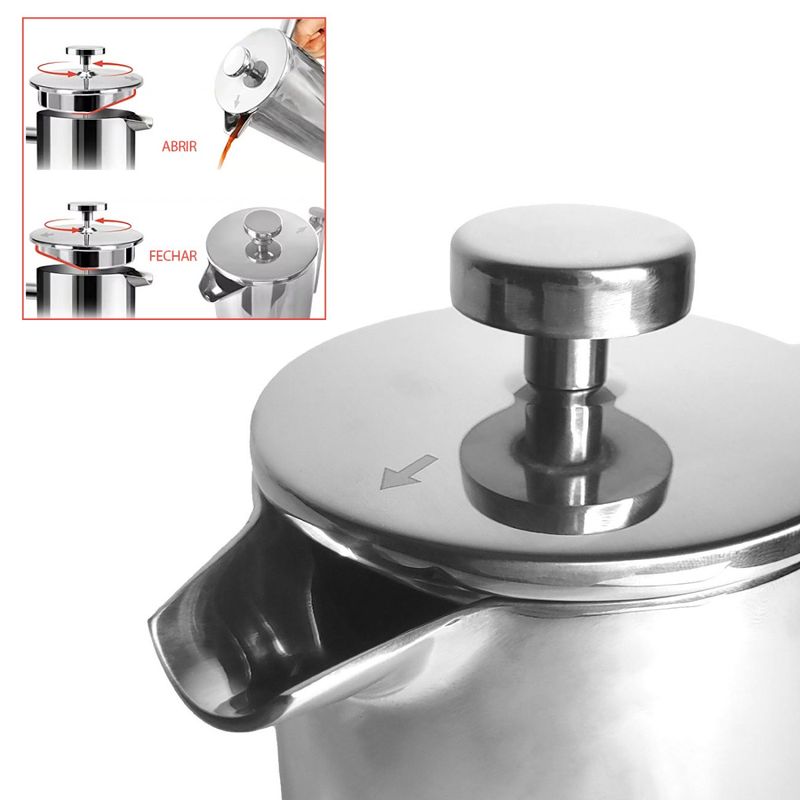 Cafeteira Prensa Francesa. A cafeteira francesa utiliza um sistema simples e de otima filtragem, dispensando o filtro de papel. A prensa francesa consiste da jarra, tampa com haste e filtro anexado, que separa o po da agua. Sua fusao é mais densa entre a agua e o cafe moido, permitindo que os oleos naturais do cafe sejam preservados e passam para xicara mais saboroso. A cafeteira foi produzida em aço inox que mantem suas propriedades mesmo quando submetido a elevadas ou baixas temperaturas. A parede possui isolamente a vacuo que isola o calor para manter o cafe quente por muito mais tempo.