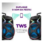 Caixa de Som Amplificada Mondial Connect Lights Plus CM-700A Caixa de Som Amplificada Multiuso Connect Lights Plus CM-700 é perfeita para levar a festa com você! Com 700W RMS de potência e alto-falante de 15 polegadas, oferece som potente e versátil. Conta com conexão Bluetooth, entrada USB, entrada auxiliar, entrada para microfone e guitarra, além de rádio FM e bateria interna recarregável, permitindo levar o som para qualquer lugar. Pode ser recarregada na tomada 127V ou 220V (bivolt) e também possui entrada 12V DC para conectar em baterias externas, como no carro.Com o Bluetooth, você toca músicas diretamente do celular sem fios. Já a tecnologia TWS (True Wireless Stereo) permite conectar duas caixas CM-700 via Bluetooth, duplicando a potência do som. O display digital facilita a visualização das funções, e as luzes Flash Light tornam o ambiente ainda mais animado.Destaques do ProdutoMúltiplas conexões: USB, auxiliar, microfone e guitarra.