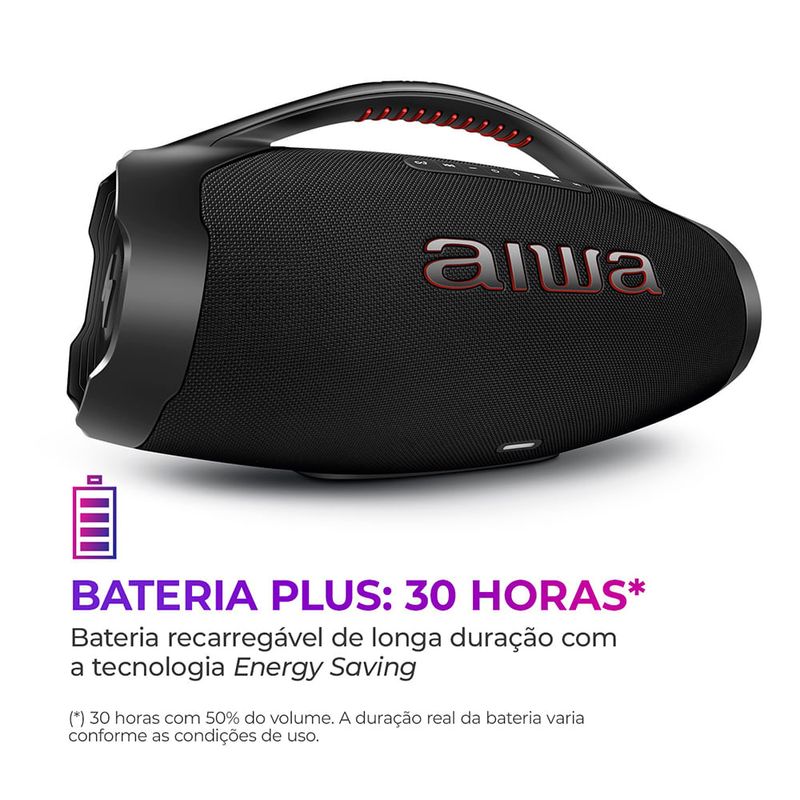 Reunir nossa família e amigos e desfrutar de uma boa música é um dos prazeres da vida, né? Curta um som potente e de alta definição com a Boombox Plus AIWA AWS-BBS-01-B! A caixa de som portátil foi projetada com sistema de som de 3 vias - 1 subwoofer, 2 midrange e 2 tweeters -, além de ter dois radiadores passivos laterais, 200W RMS de potência e o DNA japonês da marca AIWA. Com o certificado IP66, você e sua turma podem ouvir sua playlist favorita na beira da piscina ou na praia sem preocupação, já que a Boombox é resistente a jatos potentes de água e tem proteção total contra poeira. Incrível, né? Saiba mais sobre a AWS-BBS-01-B: