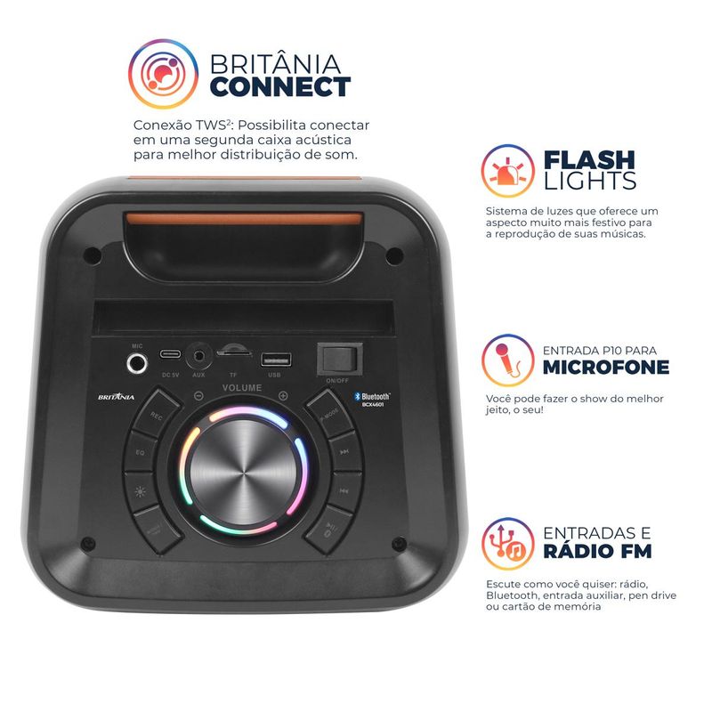 A Caixa de Som Amplificada Britânia BCX4601 Flash Lights é a companhia ideal para suas festas. Com uma potência de 350W, garante pura diversão e qualidade sonora excepcional. Equipada com 2 woofers de 4” e tweeters, proporciona graves profundos e agudos nítidos. Sua bateria interna oferece até 15 horas de autonomia, permitindo que a festa continue sem interrupções. Com Bluetooth V5.0, conecte seu smartphone facilmente e desfrute de uma experiência sonora sem igual. Além disso, o sistema de luzes Flash Lights da Caixa de Som Amplificada adiciona um toque extra de diversão, transformando qualquer ambiente em uma verdadeira pista de dança. Não deixe sua festa sem a trilha sonora perfeita e a atmosfera certa – escolha a Caixa de Som Amplificada Britânia BCX4601 Flash Lights e leve sua experiência musical a um novo nível. • Entrada USB para reprodução de música • Entrada AUX IN (P2) • Entrada cartão de memória • 2 Alto Falantes de 4"" • 1 entrada para Microfone externo (P10) • Bluetooth 5.3 • Rádio FM • Display Digital • Equalização digital pré-programado • Flash Light • Memorização de estações de rádio • Função Britania Connect (conectividade entre duas BCX4601) TWS • Função Repeat (One, All) • Função REC para gravar sons do microfone no pen drive ou TF • Bateria interna de 3,7V/4500mAh.
