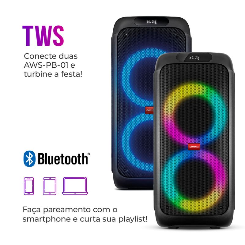 FUNÇÃO TWS: DUPLIQUE SUA EXPERIÊNCIA: Amplie o som da sua festa com a função TWS (True Wireless Sound). Basta conectar duas PartyBox AIWA AWS-PB-01 para sincronizar músicas e luzes e duplicar o som.