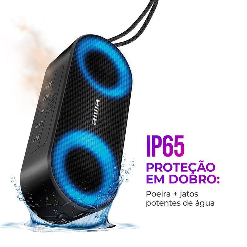 PROTEÇÃO IP65: Proteção em dobro! Resistente a jatos de água e poeira, o Speaker AIWA permite que você ouça música onde quiser: no parque, na piscina e até na praia.
