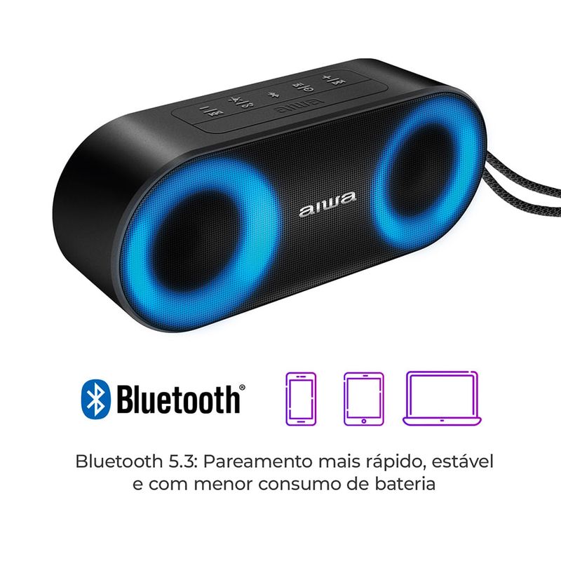 FUNÇÃO TWS: DUPLIQUE SUA EXPERIÊNCIA SONORA: Amplie o seu som com a função TWS (True Wireless Sound): basta conectar dois Speakers AIWA e duplicar a potência sonora.
