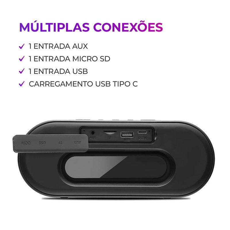 LEVE PARA QUALQUER LUGAR!: A caixa de som é compacta e vem com alça para transporte. Curta o som com sua galera onde quiser!