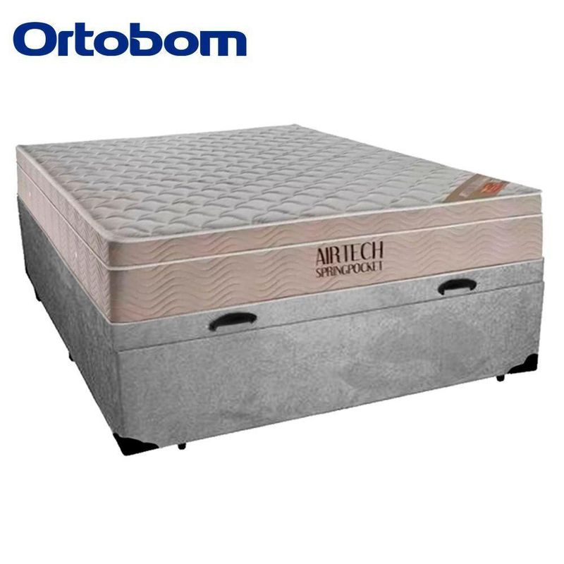 Cama Baú Casal Suede + Colchão Casal Ortobom Airtech Molas Superpocket (65x138x188) Cor:cinza