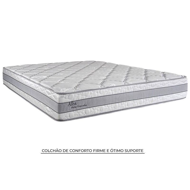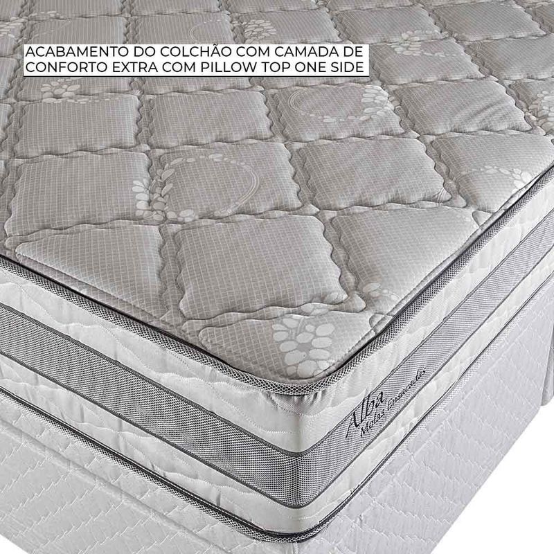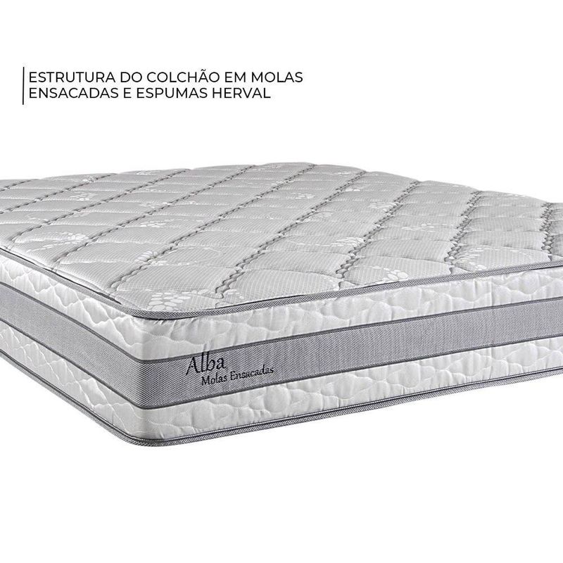 ESTRUTURA O colchão Alba é um modelo de conforto firme, que entrega ótimo suporte, graças à combinação de molas e espumas Herval. Seu acabamento é dado pelo Pillow Top One Side, que garante uma noite de conforto ímpar. A base em madeira eucalipto entrega firmeza e ótima sustentação, e a abertura de sua tampa conta com mecanismo em molas em aço. REVESTIMENTO O colchão Alba tem revestimento em tecido Malha que é caracterizado por produzir alto nível de conforto. A base é revestida em Jacquard branco, que entrega toque suave e garante qualidade à base.