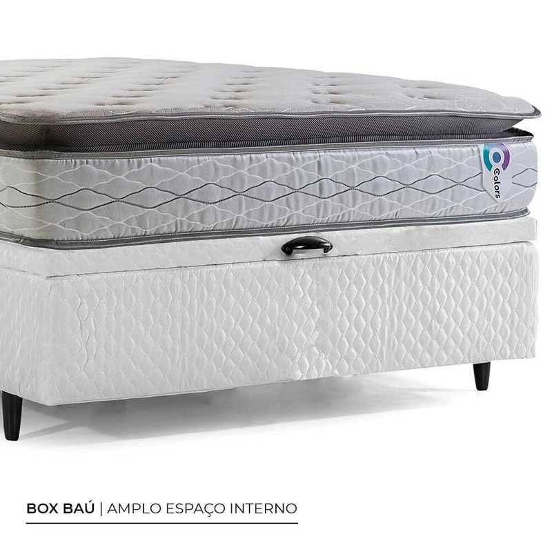 DIMENSÕES Tamanho do Colchão (AxLxP): 34 x 138 x 188 cm Peso: 30 kg Tamanho da Base (AxLxP): 46 x 138 x 188 cm Altura dos pés: 11 cm Altura interna baú: 23 cm Peso da Base: 50 kg