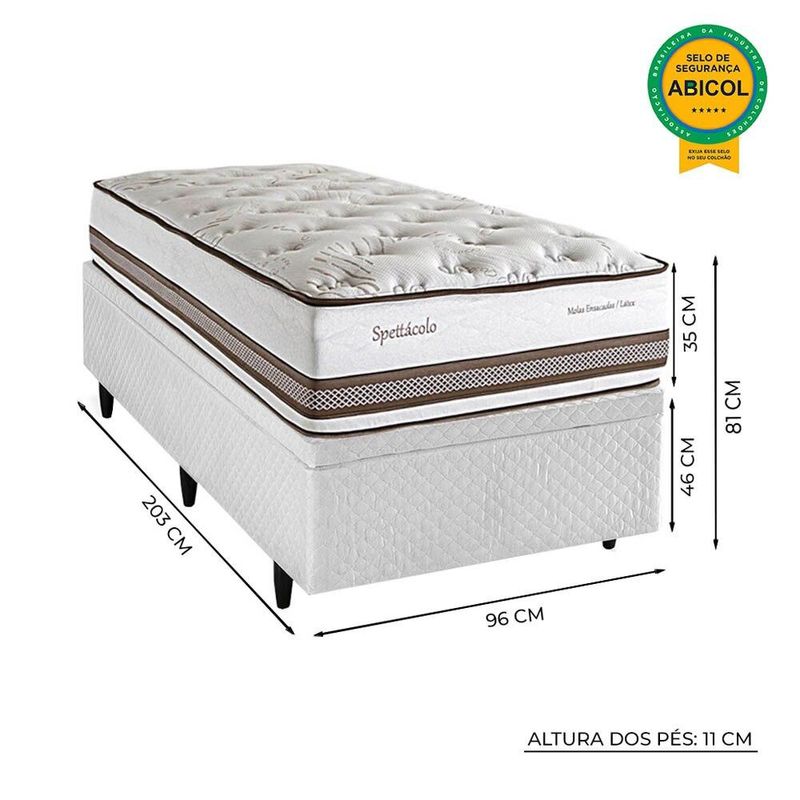 DIMENSÕES (AxLxP | Peso) Colchão: 35x96x203 cm | 23 kg Base: 46x96x203 cm | Pés: 11 cm | 50kg Cama Completa: 81x96x203cm | 73kg