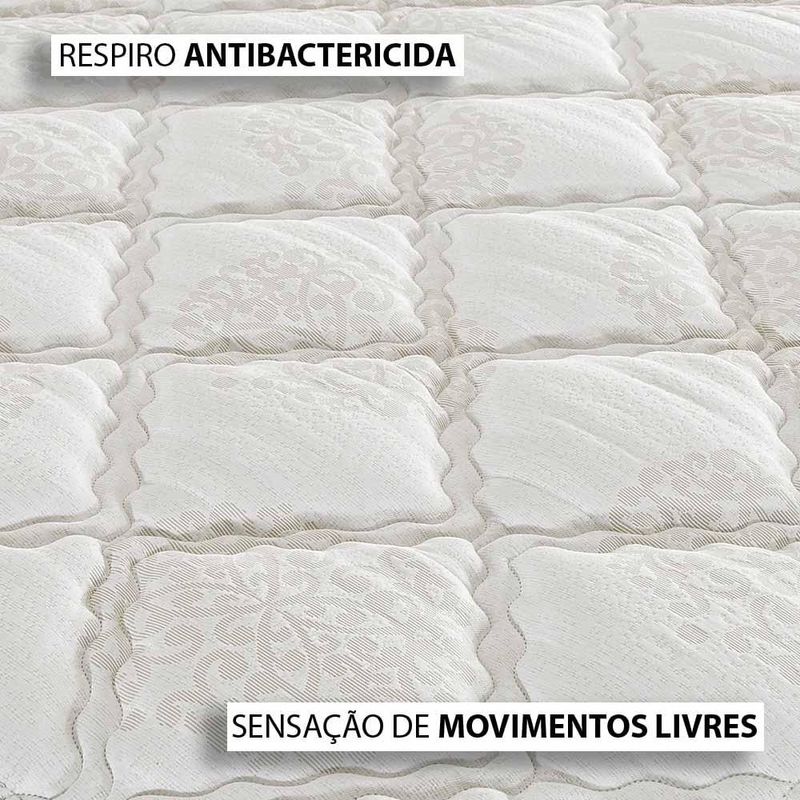 ESPECIFICAÇÕES CAMA BOX Conforto Firme | Molas Ensacadas 194 molas p/m² fabricadas com fio de aço especial (alto teor de carbono) de 2 mm Sistema Air Mesh | respiro e proteção antibactericida Bordado Pillow Top One Side Tampo Malha 98% Poliéster, 2% Viscose | Faixa Plano 100% Poliéster | Faixinha Malha 100% Poliéster Tecido Antiderrapante | Isolante Feltro Resinado Base rígida em madeira eucalipto de reflorestamento | chapas multilaminadas