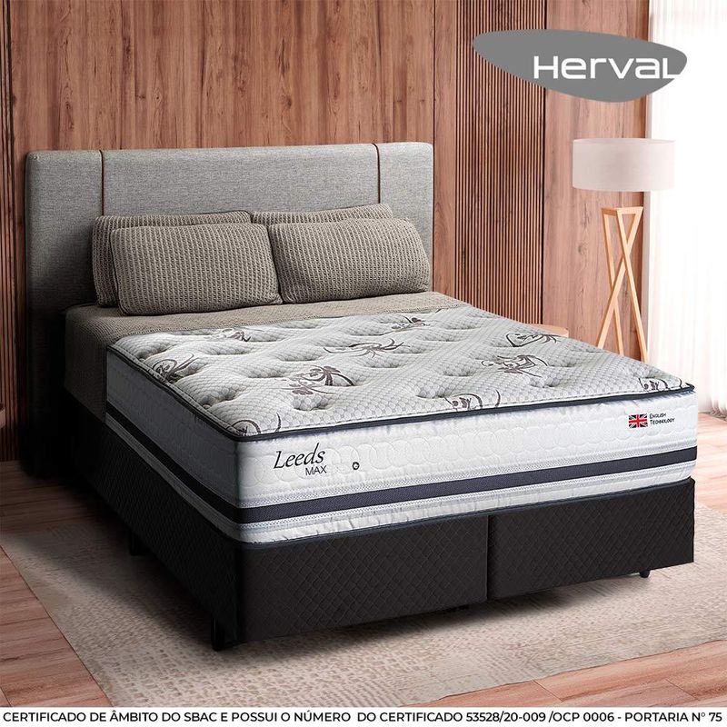 ESTRUTURA  O Colchão Herval Leeds é estruturado por molas Maxspring, que tornam o colchão firme. As espumas de alta densidade tornam o colchão firme, enquanto o Pillow Top One Side, entrega toque macio a ele. Já a Base Box Herval Meditare entrega excelente suporte ao colchão, com a estrutura em madeira eucalipto.  Já a Cabeceira Herval Plan é estruturada em MDF, grampos metálicos e cola PVA. Ela é revestida por espumas de baixa densidade, que lhe garantem toque macio.