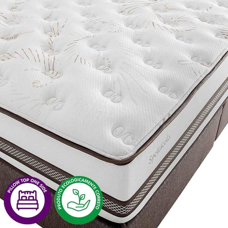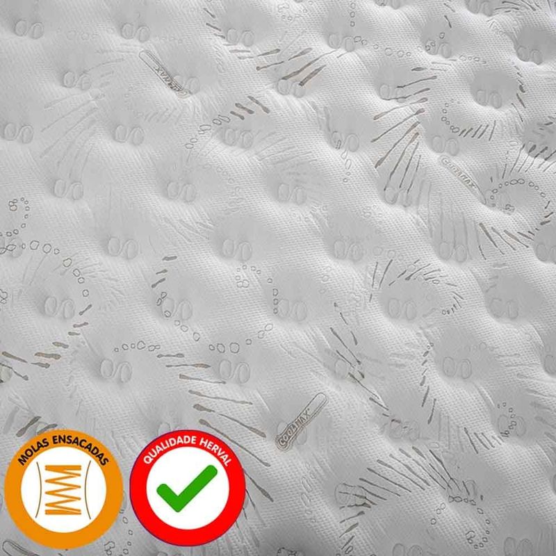 ESPECIFICAÇÕES COLCHÃO Nível de conforto: Confortável Molas Ensacadas | Total de molas: 624 Estrutura: Molas ensacadas, látex natural, espumas de alta densidade e Pillow Top One Side Revestimento: Tecido Malha Coolmax | 100% Poliéster