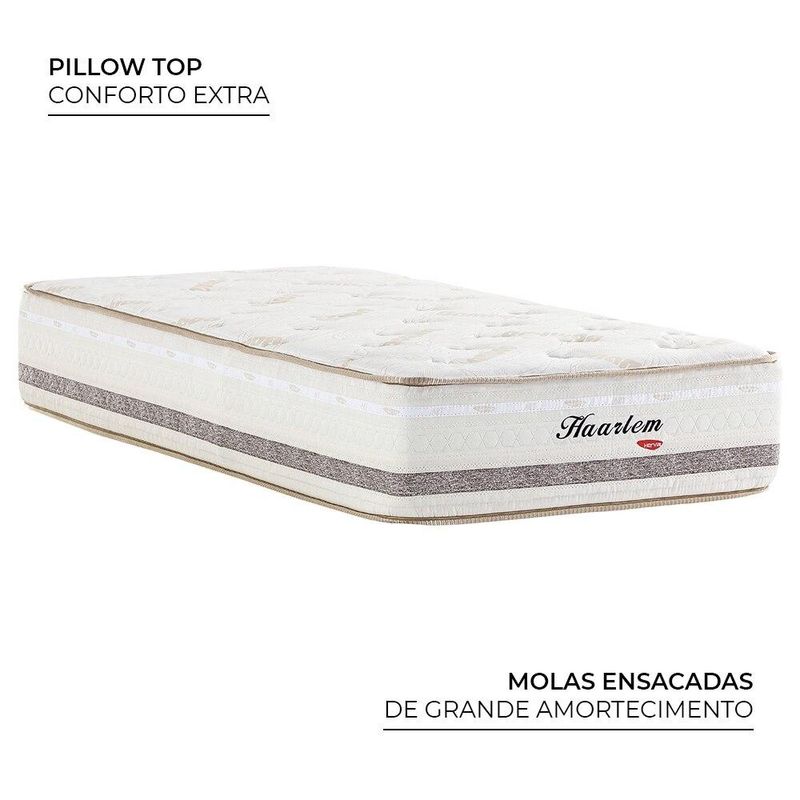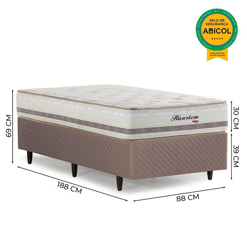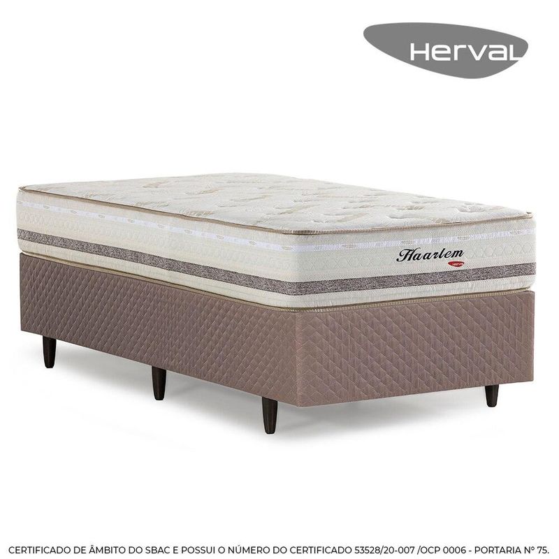 CAMA BOX HERVAL SOLTEIRO HAARLEM, 69X88X188 CM, MOLAS ENSACADASA Cama Box Herval Haarlem é um modelo excelente para proporcionar ainda mais conforto às suas noites de sono. Com molas ensacadas, ele se adapta ao seu corpo, entregando aconchego às suas noites.Já a Base Box Herval Idea possibilita diferentes composições em seu dormitório, entregando elegância e suporte ao colchão. ESTRUTURAO Colchão Herval Haarlem é um modelo firme. As molas ensacadas que o compõem entregam conforto uniforme e se adequam ao seu corpo. Sob as molas, há a Ecospuma®, que mescla diferentes densidades, garantindo sustentação uniforme e reduzindo chances de deformação.Sob o molejo do colchão há o Pillow Top One Side, camada extra de conforto que entrega toque aconchegante e anula a necessidade de virar o colchão.A Base Box Herval Idea possui estrutura em madeira eucalipto, que proporciona firmeza e sustentação à mesma medida, além excelente suporte ao colchão. REVESTIMENTOO Colchão Herval Haarlem é revestido em tecido Malha Bambu, de toque macio. Esse tecido conta com respiração entre as camadas, que promove a troca de calor, tornando mais agradável a sua temperatura. Finalizando o colchão, o bordado, com lâminas de espuma D20, lhe entrega conforto.A Base Box Herval Idea é revestida em tecido 100% poliéster, na cor marrom, possibilita composições elegantes. CARACTERÍSTICASMARCA: HervalMODELO: HaarlemUSO: SolteiroCOR: Marrom ESPECIFICAÇÕESCOLCHÃOConforto Firme;Molas Ensacadas | 194 molas p/m²Espuma de alta densidade;Pillow Top One Side;Tampo | Malha Bambu 59% Poliéster, 41% Viscose;Faixa | tecido Plano 51% Poliéster, 49% Algodão.Isolante Feltro Resinado;Tecido Antiderrapante.BASEMadeira de eucalipto;Chapas MDF multilaminadas;Revestimento em tecido 100% poliéster;Tecido antiderrapante no tampo. SUPORTE DE PESO INDIVIDUALAté 1,70m e 100KgAté 1,80m e 110KgAcima de 1,80m e 120Kg MONTAGEMEste produto é entregue montado.Necessário encaixe do s pés pelo sistema de rosqueamento, encaminhados dentro do box. ITENS INCLUSOS01 Colchão | VL16306901 Base | VL152148  DIMENSÕESCOLCHÃO | (AxLxP): 28 x 88 x 138 cmPeso: 19 kgBASE | (AxLxP): 39 x 88 x 188 cmAltura Pés: 11 cmPeso: 19 kgCAMA BOXTamanho (AxLxP): 69 x 88 x 188 cmPeso: 38 kg. GARANTIA12 meses nas molas06 meses demais componentes