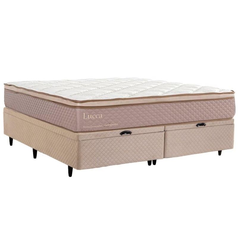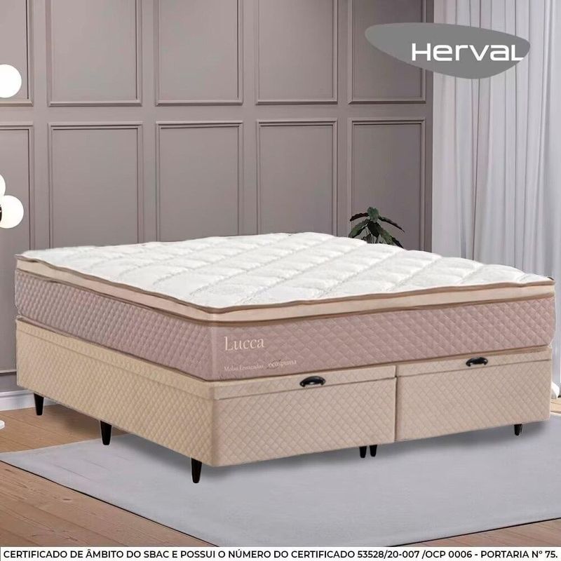 CAMA BOX KING BAÚ HERVAL LUCCA, MOLAS ENSACADAS, 73X193X203 CM, SUEDE BEGE A Cama Box King Baú Herval Lucca foi projetada para proporcionar um sono reparador. Além do conforto, essa cama possui um baú integrado, permitindo mais organização e aproveitamento de espaço.