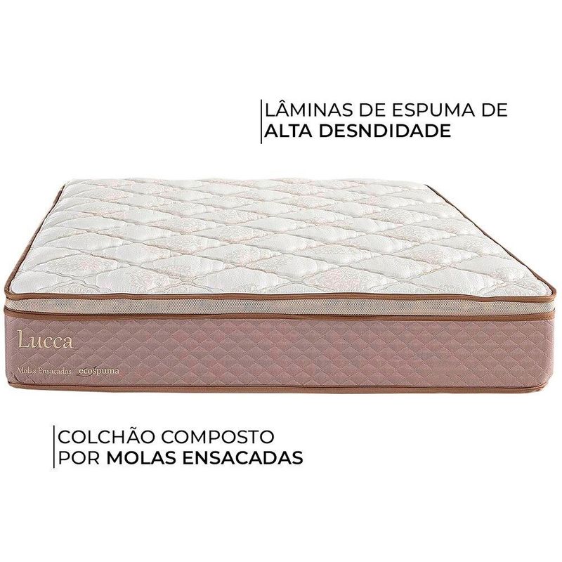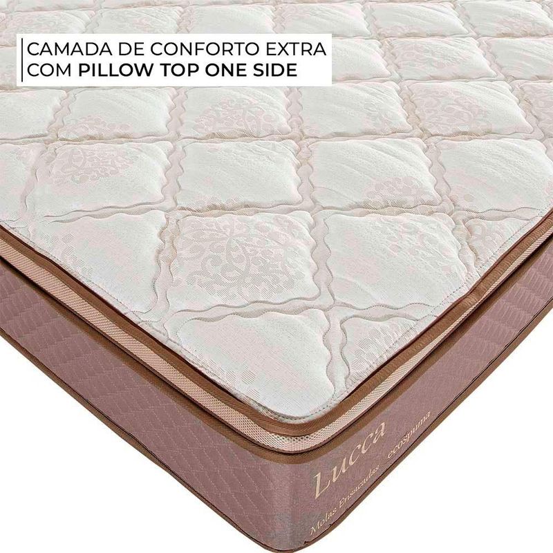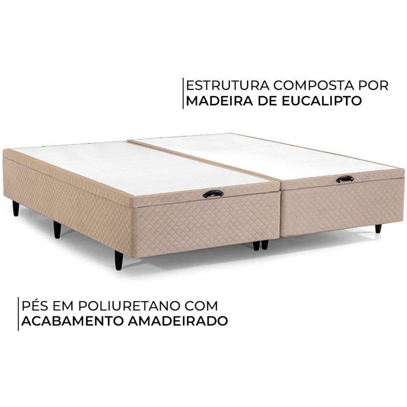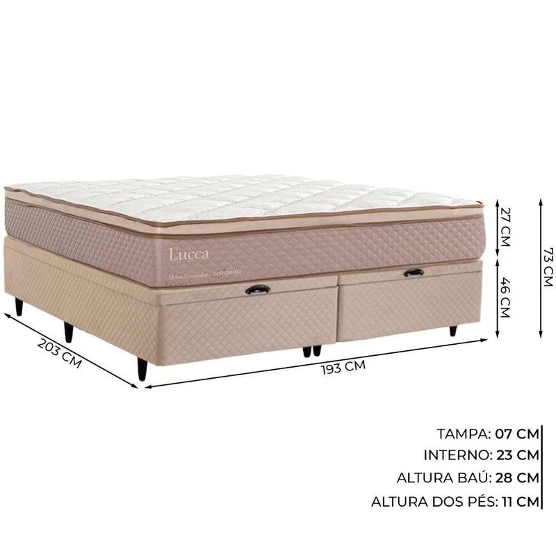 ESTRUTURA O colchão conta com molas ensacadas, que proporcionam suporte uniforme. Além disso, a Ecospuma® combina diferentes densidades de espuma para maior suporte. Na estrutura há o Pillow Top One Side, camada extra de conforto. A base é uma estrutura de baú feita de madeira de eucalipto, oferecendo alto suporte ao colchão. As molas permitem a abertura da tampa, aproveitando ao máximo o espaço. REVESTIMENTO O colchão é revestido em malha, de toque suave. A base é revestida em suede bege, adicionando beleza ao produto.