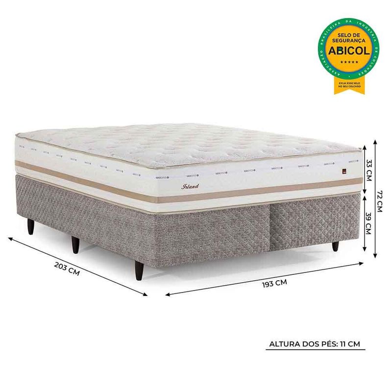 DIMENSÕES (AxLxP | Peso) Colchão: 33x193x203cm | 33 kg Base: 39x193x203cm | Altura dos Pés: 11 cm | 40 kg Cama completa: 72x193x203cm | 73 kg