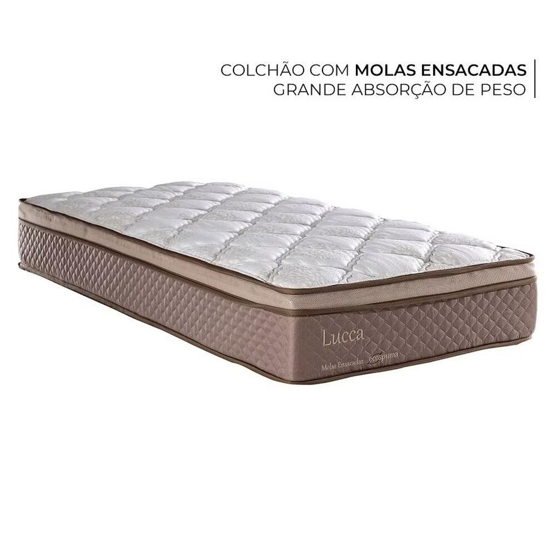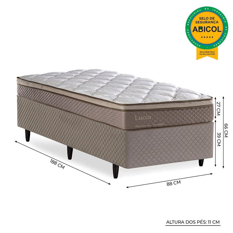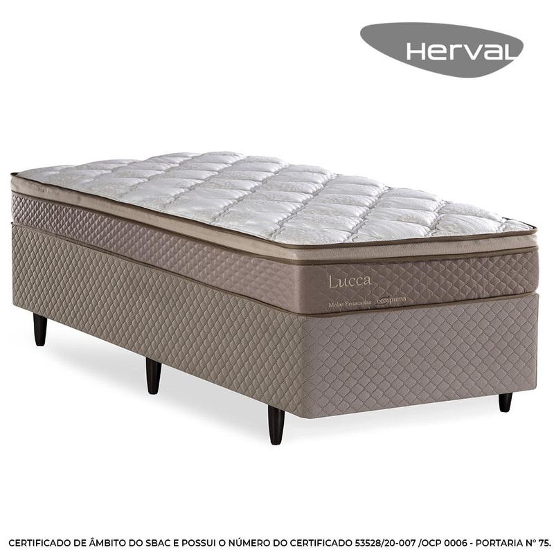 ESTRUTURA A estrutura interna do Colchão Herval Lucca é com molas ensacadas. Elas entregam uma estrutura firme e, associado ao Pillow Top One Side, camada extra de conforto, esse colchão entrega mais conforto as suas noites de sono. A Base Box Idea é a garantia de alto suporte ao seu colchão devido à sua estrutura em madeira eucalipto, que conserva o produto, evitando a produção de rangidos.