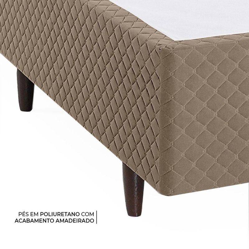 BASE Estrutura em madeira de Eucalipto de reflorestamento; Chapas de madeira; Revestimento em tecido Suede 100% Poliéster; Tecido antiderrapante no tampo; Pés em PU com acabamento madeirado.