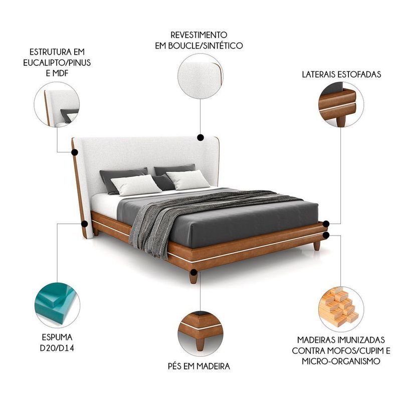 Crie um ambiente aconchegante e sofisticado no seu Quarto com a Cama Casal 140cm Com Cabeceira Many P02 Bouclê Off/Caramelo, da Mpozenato.Sua estrutura é fabricada em madeira reflorestada, unindo pinus, eucalipto e MDF, tratados especialmente contra mofo, cupim e micro-organismos. O travamento estrutural é assegurado por grampos, fixados com grampeadores pneumáticos, o que garante resistência e uma vida útil prolongada. A Cabeceira e a Base Box possuem estofamento em espuma D-20 e D-14, proporcionando um conforto único. Com revestimento de altíssima qualidade, essa Cama é ideal para noites de sono revigorantes e momentos de relaxamento. Além disso o design bipartido da base facilita tanto o transporte quanto a montagem, tornando tudo mais eficiente. Os pés em madeira conferem charme e elegância, elevando a decoração do seu Quarto Casal com um toque acolhedor e repleto de estilo.Adicione em seu carrinho de compras e garanta agora mesmo! Especificações Dimensões do ProdutoLargura: 195 cm. Altura: 110 cm. Profundidade: 215 cm. Peso: 76 Kg. IDEAL PARA COLCHÃO DE CASAL 138X188CM.NÃO ACOMPANHA COLCHÃO.Outras medidas (LxAxP)Medidas da Cama: 148x28x194 cm.Medidas Internas da Cama: 139x6x189 cm.Medidas da Cabeceira: 195x110x42 cm.Características do ProdutoMaterial da estrutura: Madeira de Eucalipto/MDF 6mm. Densidade da Espuma: Espuma D-20/D-14. Revestimento: Bouclê/Sintético. Peso Suportado: 300 Kg distribuídos. Possui Pés: Sim. Material dos Pés: Madeira. Altura dos Pés: 13cm. Possui Rodízios: Não. É Bipartido: Sim. Acompanha Colchão: Não. Acompanha Cabeceira: Sim. Diferenciais: - Design moderno. - Imunização contra mofo, cupim e micro-organismos. - Cabeceira estofada com espuma D-20 na estrutura e D-14 nos adornos laterais. - Cama com lateral estofada. - Pés de madeira. Sistema de Montagem: Parafusos. Manual de Montagem: Não. Complexidade da Montagem: Baixa. Conteúdo da Embalagem: 1 Cama. Volumes: 3 Volumes. do Fabricante: 90 dias contra defeitos de fabricação. Montagem: Recomendamos que seja feita por um . Recomendação de limpeza: Utilize pano levemente úmido. As dimensões do estofado estão sujeitas a uma variação de até 3 cm.A tonalidade do produto pode apresentar pequenas diferenças devido às variações de lote do tecido.Observações importantes:- Produto para uso residencial em ambiente interno, não devendo ficar exposto diretamente ao sol, calor e umidades excessivas.- As imagens são meramente ilustrativas, não acompanham objetos de decoração e eletrônicos.- Confira o estado da embalagem, não devendo assinar o comprovante em caso de danos.- Não asseguramos, no ato da , por subir escadas/elevadores, pelo transporte por guincho em apartamentos ou montagem, desmontagem e instalações. Eventuais despesas são por conta do comprador.- Confira as dimensões do produto e certifique-se de que passará normalmente por supostos elevadores, portas, escadas e/ou corredores de sua residência.