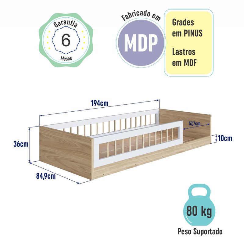 A Cama Montessoriana de Solteiro Linha Affetto da Completa Móveis é a escolha ideal para compor quartos infantis com conforto, segurança e muito estilo. Inspirada no método Montessori, essa cama foi projetada para incentivar a autonomia das crianças desde os primeiros anos de vida, proporcionando um ambiente acessível, lúdico e criativo que estimula o desenvolvimento cognitivo e emocional. Com um design moderno e acolhedor, conta com grades em madeira Pinus que oferecem leveza visual e um toque natural ao móvel. Produzida com estrutura em MDP de alta qualidade e estrado em MDF, combina resistência com durabilidade, garantindo maior segurança para o uso diário. A cama é indicada para colchões de solteiro e possui altura adequada para facilitar o acesso da criança sem a necessidade de ajuda constante, contribuindo para a independência na rotina.