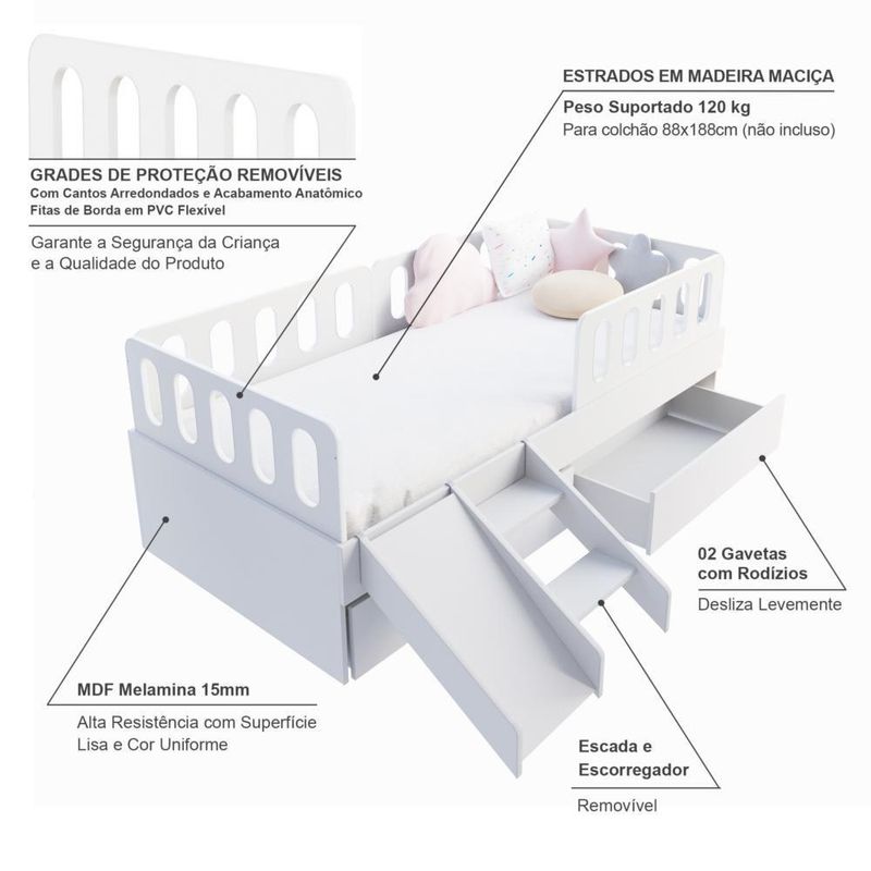 Diferenciais: MDF Melamina 15mm, Estrados em Madeira Maciça, 02 Gavetas, Escadinha/Escorrega, 03 Grades e Cabeceira e Peseira Anatômica. (Todas as Grades são Removíveis)