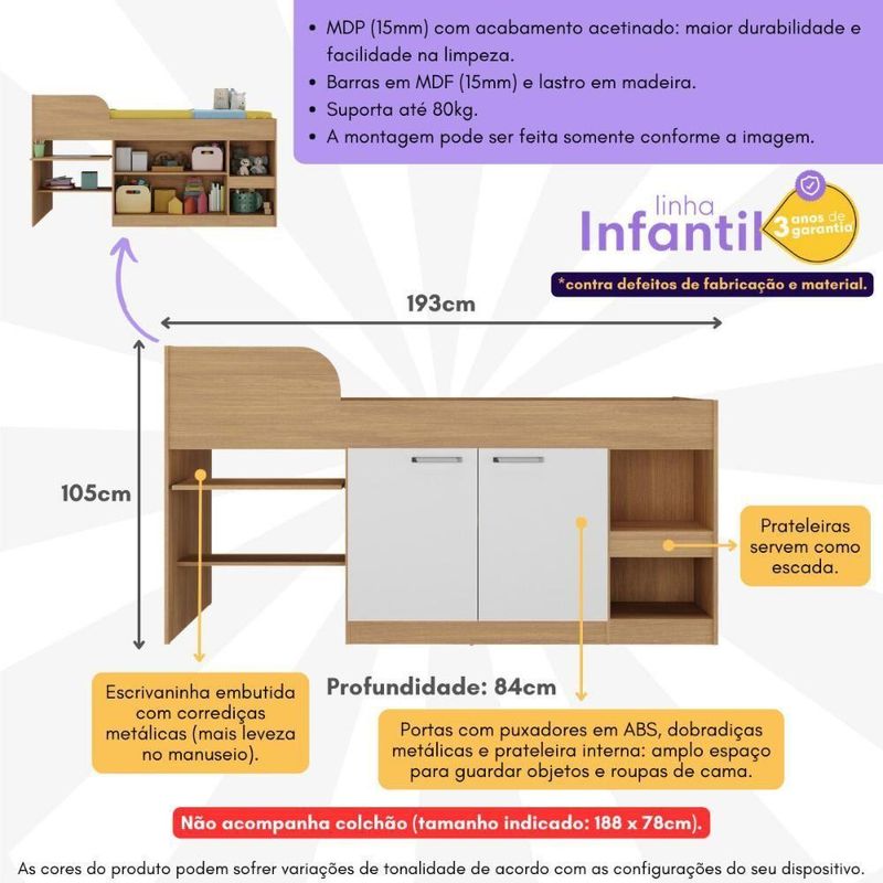 A Cama Solteiro Multifuncional MP4230 da Multimóveis é a solução ideal para otimizar o espaço no quarto. Produzida em MDP de 15mm com acabamento acetinado (cerca de 20% de brilho), garante durabilidade e resistência, suportando até 80kg.Destaques do Produto:Multifuncional: Possui 2 portas, escrivaninha embutida e prateleiras que viram escada.