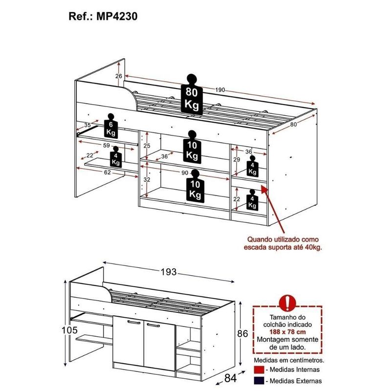 Peso: 56 kgInformações Adicionais:Não acompanha colchão (tamanho indicado: 188 x 78 cm).