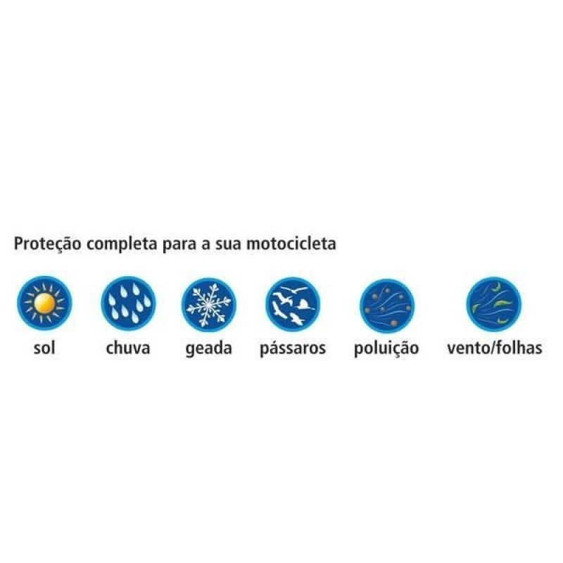 - Elástico resistente nas extremidades.- Cinta para envolver a moto, proporciona maior segurança na fixação e assegurando que a capa não seja levada pelo vento.