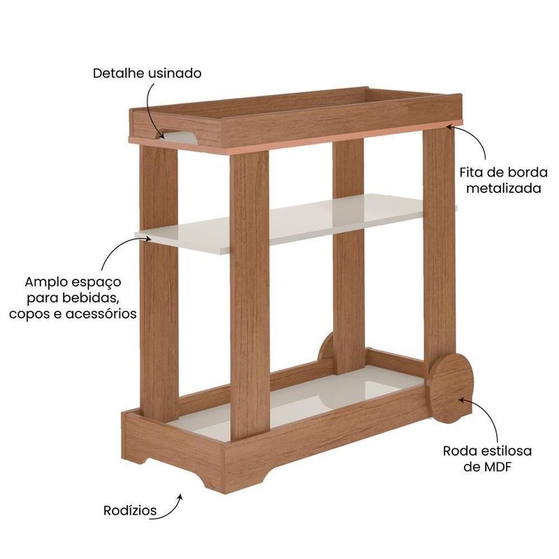 Características adicionais: Detalhe usinado, fita de borda metalizada, amplo espaço para bebidas, copos e acessórios, Rodas estilizada em MDF, 4 rodízios