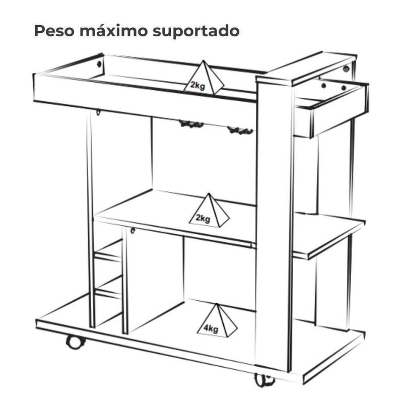 Peso máximo suportado: 8 kg (tampo 2kg, prateleira 2kg e estrutura 4kg)