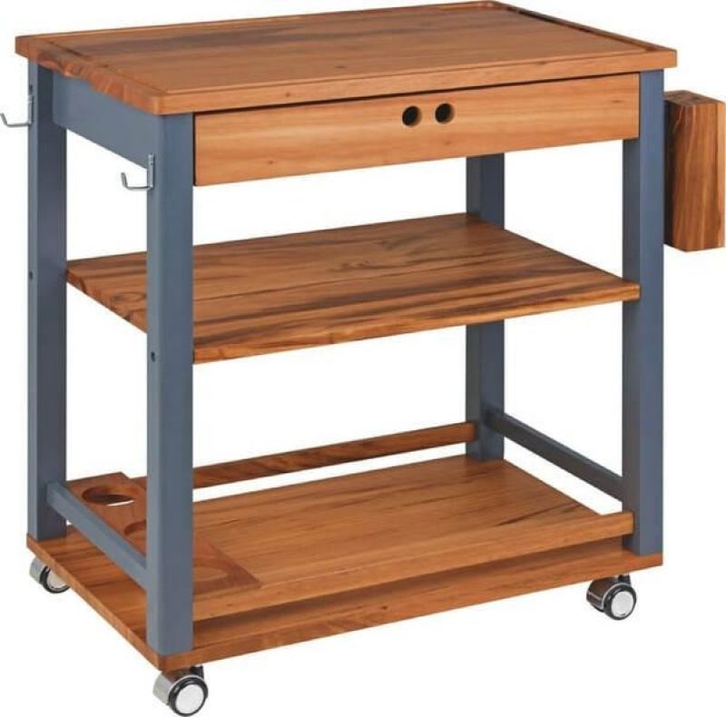 - Acompanha uma tábua, cepo para facas e rodízios;
