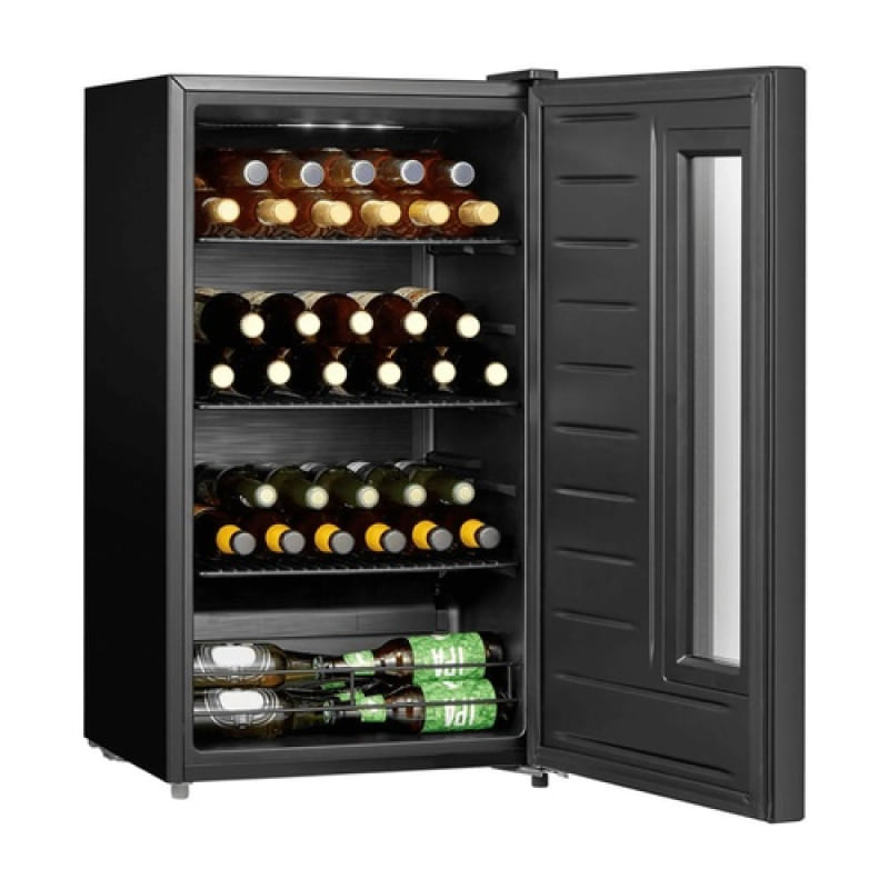 A Cervejeira Frost Free 82 Litros Preta Midea é perfeita para manter suas bebidas na temperatura ideal e suas cervejas bem geladas. Com um design moderno e sofisticado, ela combina perfeitamente com qualquer ambiente. Seus 5 modos exclusivos, que variam entre −4C e 18C, são ideais para gelar todo tipo de bebida: Modo Turbo, Vinho Tinto, Vinho Branco, Vinho Espumante e Cerveja. O Modo Turbo, além de resfriar as bebidas rapidamente, também pode ser acionado quando a cervejeira estiver muito abastecida, melhorando seu desempenho de refrigeração. O vidro duplo com tecnologia Low-E garante maior isolamento térmico, enquanto o Painel Touch permite ajustar a temperatura grau a grau com apenas um toque. A cervejeira ainda conta com uma capacidade excepcional: armazena até 72 latas de cerveja de 350ml, ou 51 garrafas long neck de 355ml ou 29 garrafas de 600ml. A cervejeira ideal para todas as suas bebidas, sempre na temperatura certa.