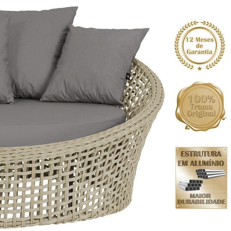 A trama artesanal em corda nautica adiciona um toque moderno e elegante, alem de proporcionar flexibilidade e conforto inigualaveis. Para completar, o estofado em tecido impermeavel assegura praticidade e bem-estar em qualquer ambiente, seja na area externa ou interna.