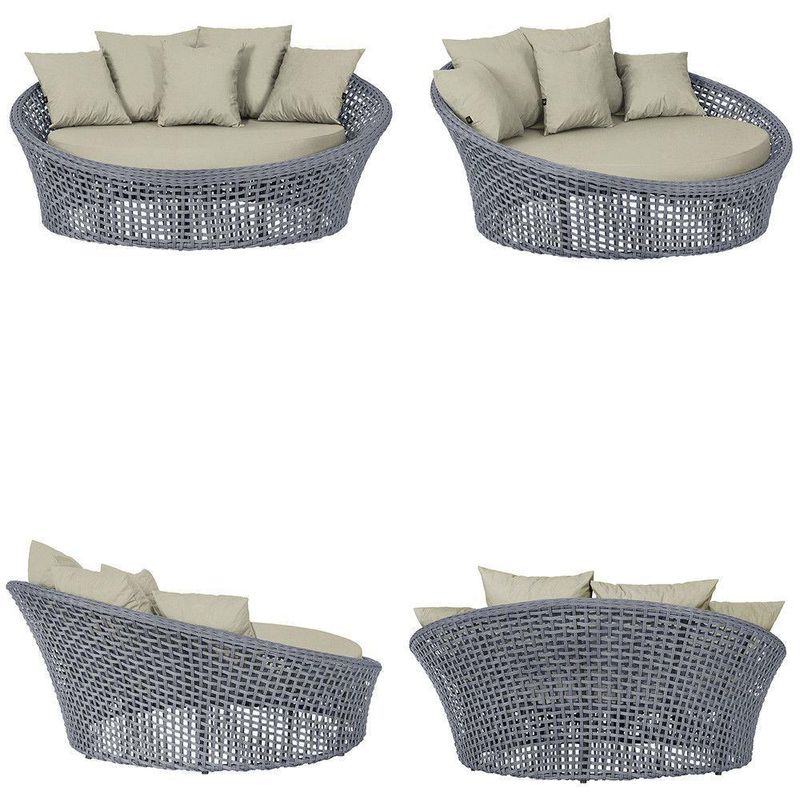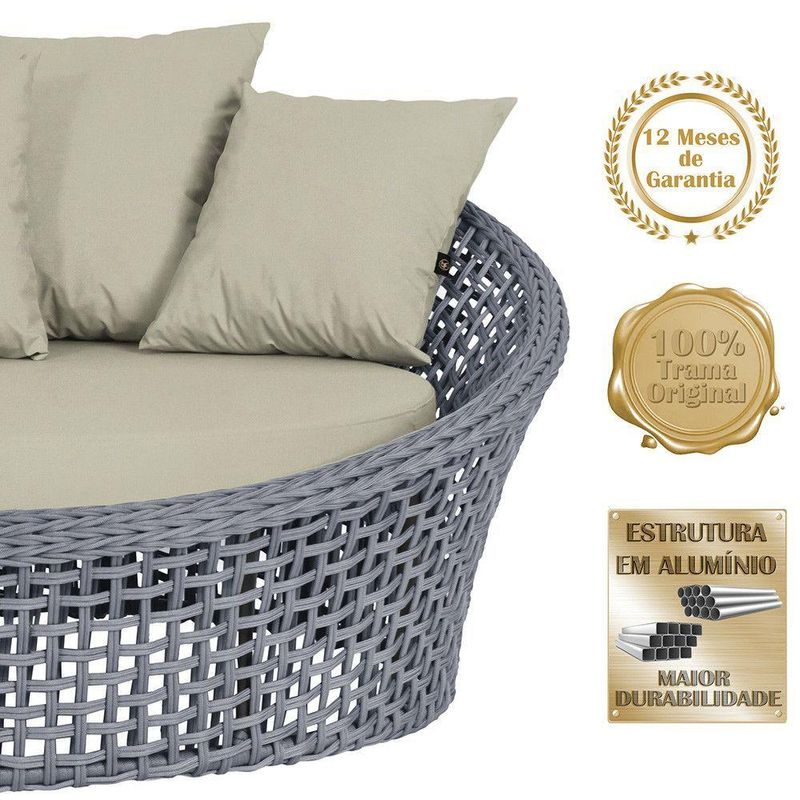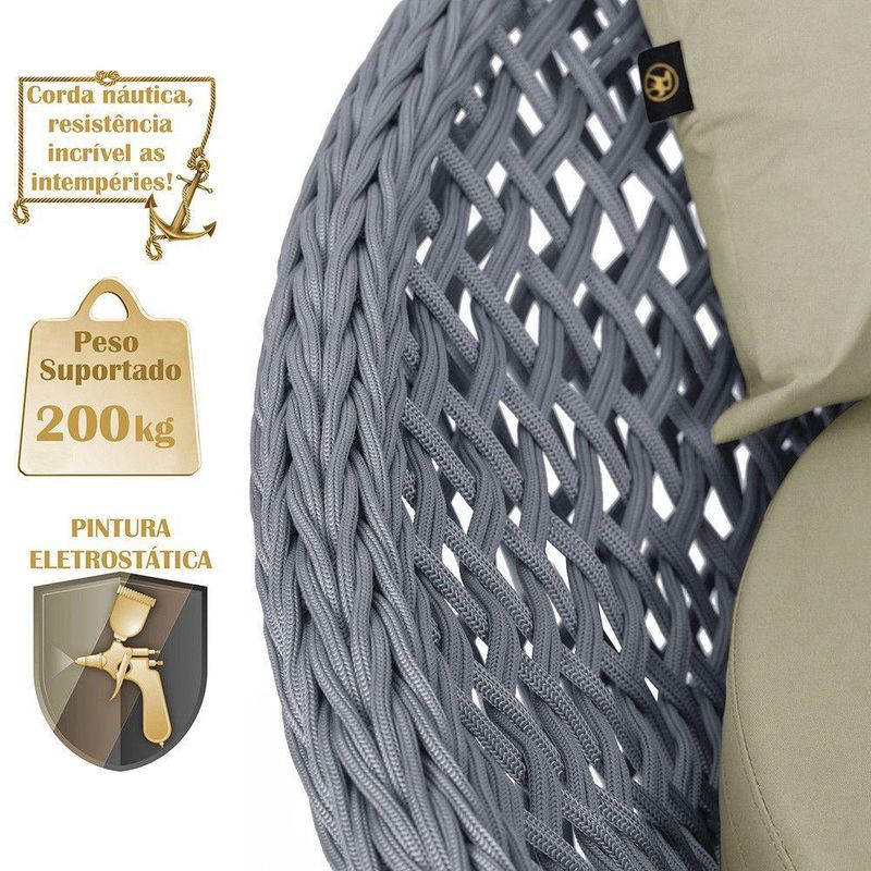 A trama artesanal em corda nautica adiciona um toque moderno e elegante, alem de proporcionar flexibilidade e conforto inigualaveis. Para completar, o estofado em tecido impermeavel assegura praticidade e bem-estar em qualquer ambiente, seja na area externa ou interna.