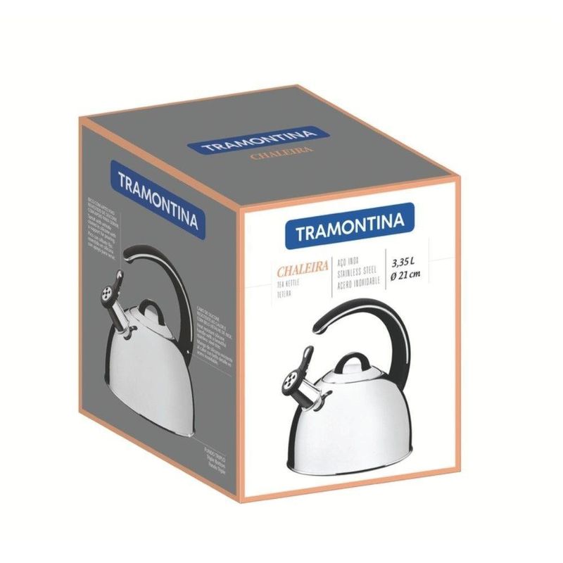 Chaleira Com Apito 3,3 L Em Aço Inox Fundo Triplo Tramontina 61488/213 Chaleira com Apito em Aço Inox Fundo Triplo 3,3 L Tramontina Com capacidade para um grande volume, a Chaleira Tramontina com Apito em Aço Inox Cabo Ergonômico Preto 3,3 L, conta com um design exclusivo e fundo triplo que aquece a água mais rápido, além de manter a temperatura por mais tempo. Você saberá o momento exato que a água entrará em ebulição graças ao apito que é acionado no momento de fervura. A Chaleira com Apito é produzida em aço inox possui um cabo ergonômico, ou seja, além do estilo, essa chaleira possui muita segurança e praticidade para a sua cozinha. Chaleira com Apito em Aço Inox Fundo Triplo 3,3 L Tramontina-Especificações TécnicasDimensões Produto (Compr. X Larg. X Alt.): 24 x 21,5 x 24,5 cm.Diâmetro: 21 cm.Capacidade: 3,3 l.Espessura: 0,6 mm.Material: Aço inox.Fundo triplo: Sim.Cabo: Baquelite antitérmico.Acabamento: Alto brilho.Pode ser utilizada nos fogões: gás, elétrico, indução e vitrocerâmico. Chaleira com Apito em Aço Inox Fundo Triplo 3,3 L Tramontina - Na sua casa!