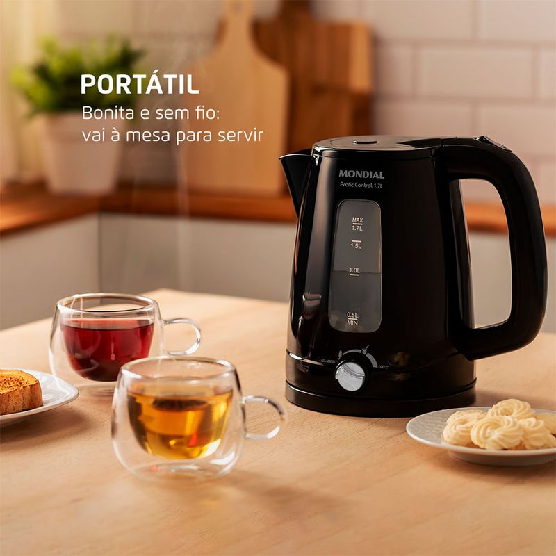 Com capacidade de 1,7 L, é possível fazer até 7 xícaras de chá de uma única vez. E seu visor transparente facilita o controle do nível de água. O sistema de aquecimento rápido reduz o consumo de energia ao ferver a água em poucos minutos. O filtro removível retém impurezas e facilita a higienização.