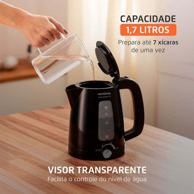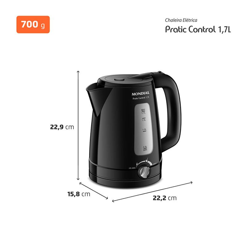 Com design moderno e jarra destacável, ela pode ser levada à mesa para servir.Muito prática, chaleira elétrica CE-17-BC atende quem valoriza agilidade. Conheça todas as funcionalidades da Pratic Control Mondial que vão facilitar seu dia a dia: