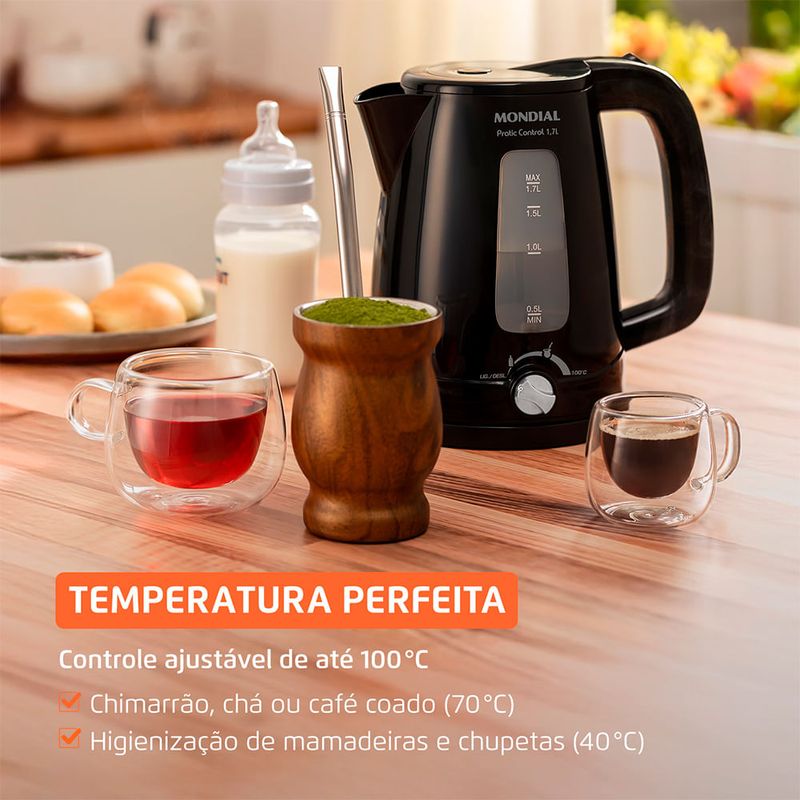 A Chaleira Elétrica Mondial Pratic Control é ideal para quem ama uma bebida quentinha - e ainda facilita a rotina de quem tem bebê em casa. Com controle de temperatura ajustável até 100 °C, ela atinge o ponto perfeito para fazer chimarrão, chá ou café coado (70 °C) e ainda higieniza mamadeiras e chupetas (40 °C). Tudo de modo intuitivo.