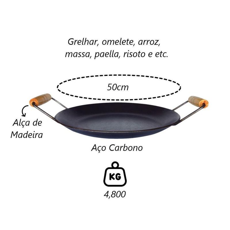 Chapa Disco Arado Aço Carbono Bifeteira Alça Madeira 50cmA chapa de disco de arado, também conhecida como disco de arado, é um utensílio de cozinha versátil e tradicionalmente utilizado em muitos países, especialmente na América Latina, para cozinhar ao ar livre. Aqui estão algumas das principais funções e usos da chapa de disco de arado. Grelhar Carnes e Vegetais, Preparar Refogados e Salgados, Fazer Omeletes e Fritadas, Preparar Pratos de Arroz e Massas, Fazer Receitas de Paella e Risotos. Em resumo, um chapa de disco de arado serve como uma ferramenta versátil para cozinhar uma variedade de alimentos ao ar livre, oferecendo facilidade de uso, distribuição uniforme de calorias e capacidade de preparar uma variedade de pratos saborosos e nutritivos.Características do Produto: