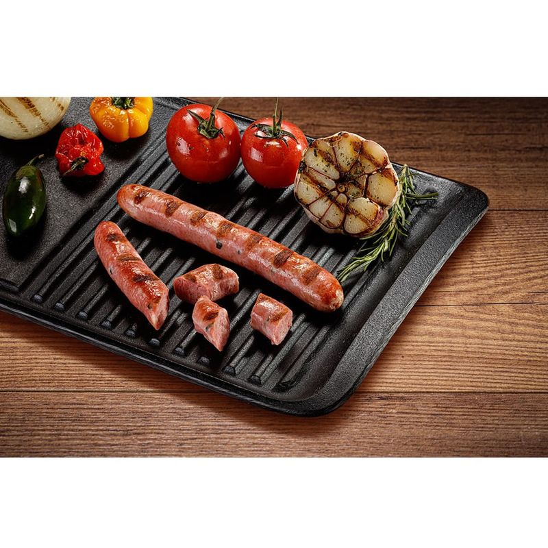 Fabricada em ferro fundido, que transmite e retém calor por mais tempo, garante o perfeito cozimento sem perda dos sucos naturais e propriedades nutritivas dos alimentos, deixando-os suculentos por dentro e grelhados por fora. Também possui camada esmaltada e 100% atóxica, não sendo necessário adicionar óleo ou gordura em excesso e facilita a limpeza.