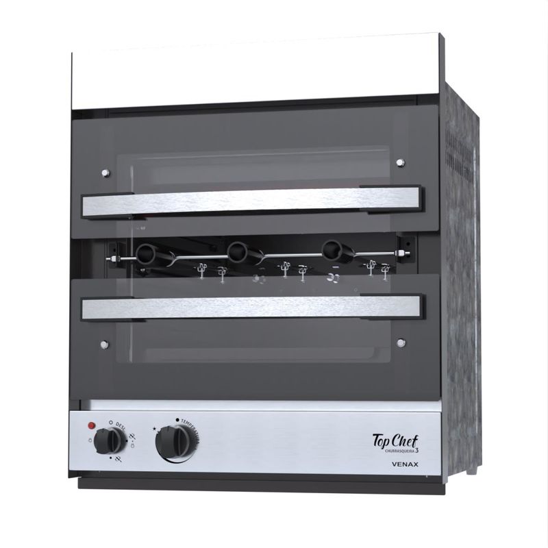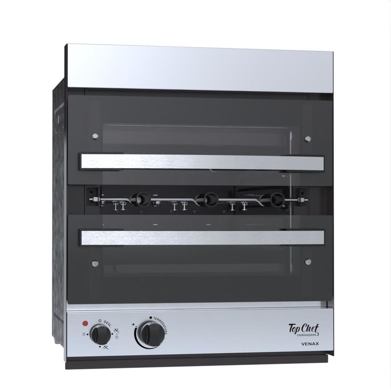 A Churrasqueira a Gás de Embutir Top Chef Possui 3 Espetos Giratórios com Capacidade de 2 Kg de Carne Cada, Queimador Infravermelho, Acendimento Superautomático, Luz Interna, Bandeja Coletora de Resíduos Esmaltada Easy Clean, Porta de Vidro Bi Partida Com puxadores em Aluminio, Corpo Interno Esmaltado Easy Clean e Acabamento Externo em Aço Inox Escovado.