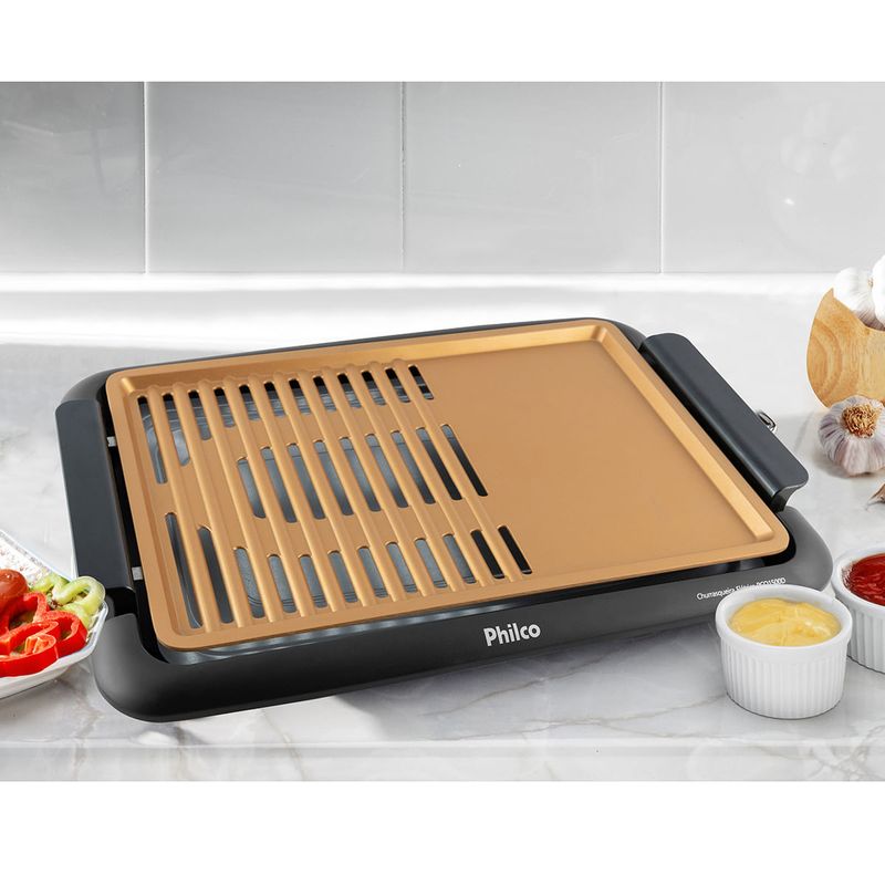 A Churrasqueira Elétrica Philco PCQ1500D tem poderoso antiaderente Maxx Gold, ele é durável, resistente e fácil de limpar, grelha os alimentos sem grudar. É ideal para ser utilizada dentro de casa, a gordura dos alimentos vai direto para a bandeja coletora, impedindo que entre em com contato com a superfície aquecida, evitando o fumaça. Saia do convencional, faça uma refeição diferente e mais saborosa com a PCQ1500D. Surpreenda a todos!