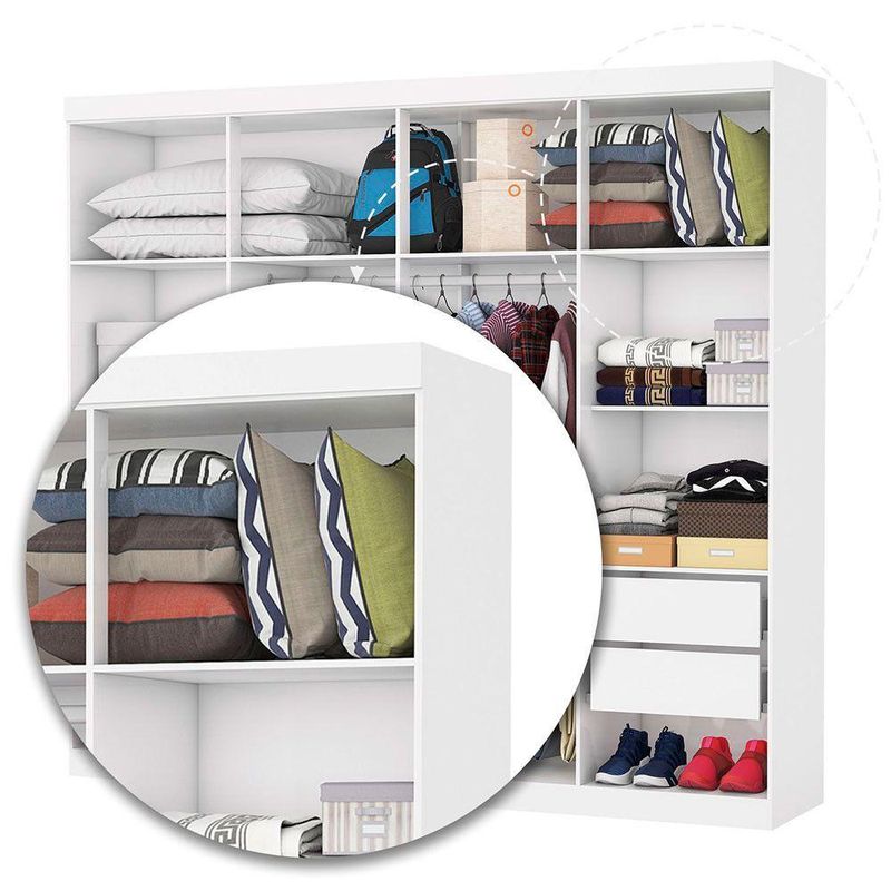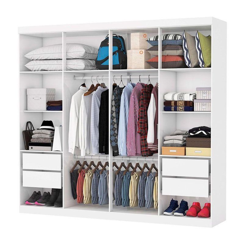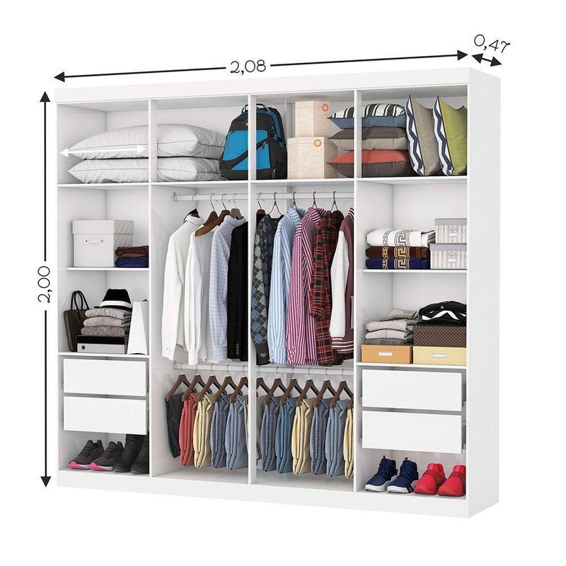 O Closet Casal Rubi com 2,07m de altura, 2,08m de largura e 0,47m de profundidade. Combinado com 4 gavetas, 4 prateleiras, 1 cabideiro e 1 calceiro, deixa o produto com uma divisao funcional capaz de proporcionar ao cliente acomodar todas as suas roupas de maneira mais organizada e com maior visibilidade. Nos maleiros cabem certinhos edredons, cobertores, travesseiros, malas, toalhas, bolsas, entre outros. As Prateleiras sao ideias para colocar roupas de cama e de banho, perfumes, kits de maquiagem, caixinhas com acessorios e bolsas menores. As quatro gavetas fixadas sobre corredicas metalicas, sao otimas para guardar blusas dobradas, shorts, malhas e roupas intimas. Estrutura do produto em MDP.