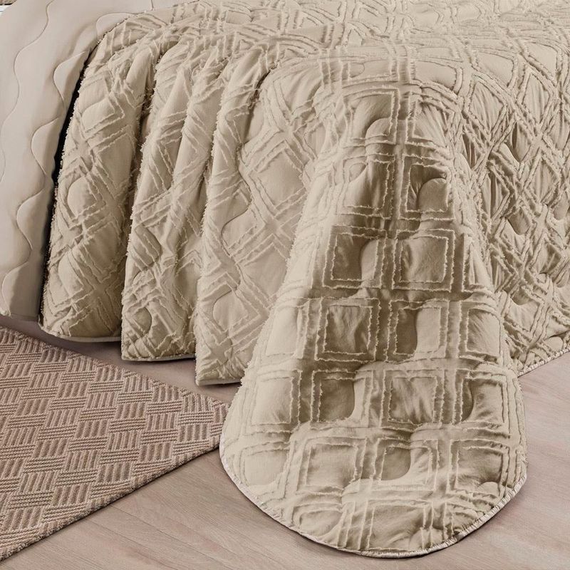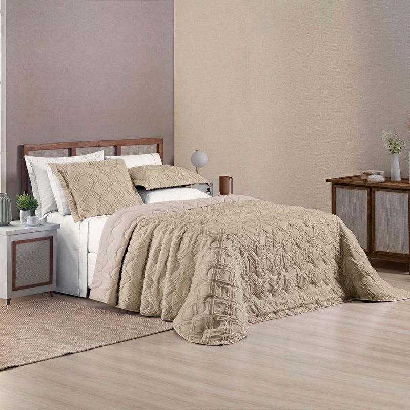 O Cobre Leito Aveline, com sua paleta de cores neutras, adiciona um toque de sutileza e classe à decoração. Feito com tecido Micropercal de 300 fios e seu composê liso de Micropercal 200 fios, sua qualidade é inegável, proporcionando uma sensação de suavidade ao toque. O acabamento em 3D no tecido é o detalhe que faz toda a diferença. Cada linha e textura criam uma profundidade visual que transforma o cobre-leito em uma verdadeira obra de arte têxtil. Combine o Cobre Leito Aveline com as almofadas da mesma coleção para um visual completo e sofisticado em seu quarto. O que vai na embalagem: 01 Cobre leito 2,60m x 2,40m02 Porta travesseiros 80cm x 55cm | medida útil: 70cm x 50cm Composição: Tecido: Superior e Inferior 100% PoliésterEnchimento: 100% Poliéster.