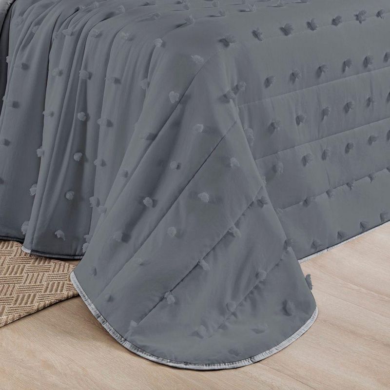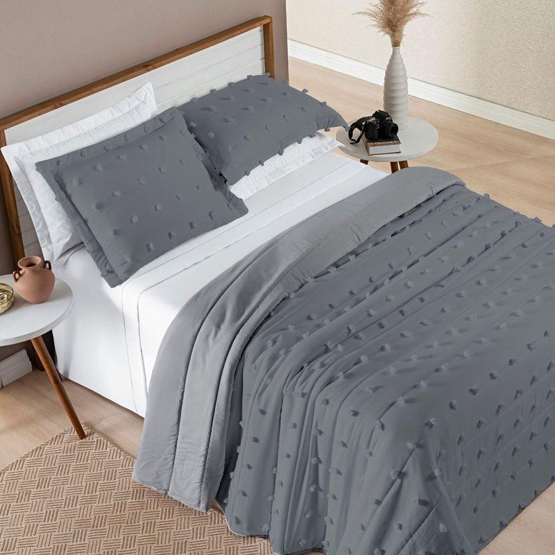 Confeccionado em tecido Micropercal com toque acetinado o Cobre Leito Poppy, com seus detalhes em pompom 3D, é como um convite ao mundo dos sonhos onde cada detalhe é uma fonte de alegria e beleza. O Cobre Leito Poppy Dupla Face é confeccionado com tecido Micropercal 300 fios, e seu composê liso em Micropercal de 200 fios. Combine o Cobre Leito Poppy com as almofadas da mesma coleção para um visual completo e sofisticado em seu quarto. O que vai na embalagem:KING 03 PEÇAS01 Cobre leito 2,80m x 2,40m02 Porta travesseiros 80cm x 55cm | medida útil: 70cm x 50cm Composição: Tecido: Superior e Inferior 100% PoliésterEnchimento: 100% Poliéster