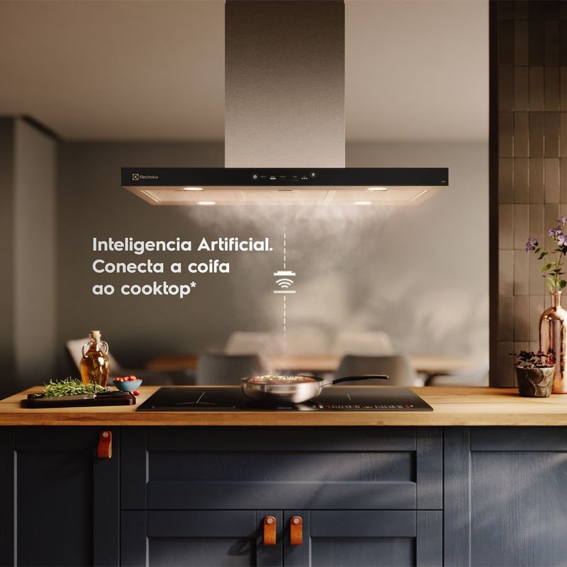 Para otimizar a experiência durante o preparo de receitas, conte com a Inteligência Artificial Hob2Hood uma grande inovação da Electrolux que conecta de forma automática a Coifa ao Cooktop², proporcionando uma experiência diferenciada e sem preocupações, já que o sistema identifica a utilização do cooktop, o número de zonas em uso, liga e configura o exaustor automaticamente.
