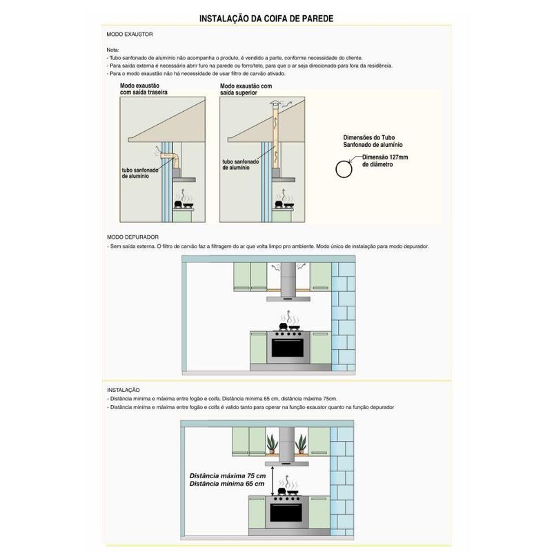 Duto dividido em superior e inferior com regulagem de altura. mín 68 cm e máx 100 cm já considerando a altura da base da coifa
