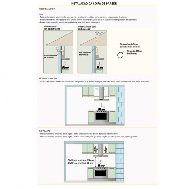 Observação, este modelo não aceita instalação no teto. Caso precise de coifa para instalar no teto, basta pesquisar por Coifa de ilha, e colocar a marca desejada