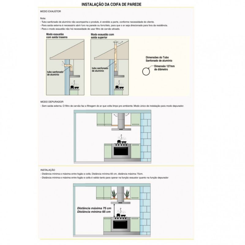 Observação, este modelo não aceita instalação no teto. Caso precise de coifa para instalar no teto, basta pesquisar por Coifa de ilha, e colocar a marca desejada
