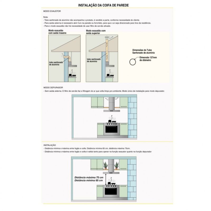 Observação, este modelo não aceita instalação no teto. Caso precise de coifa para instalar no teto, basta pesquisar por Coifa de ilha, e colocar a marca desejada